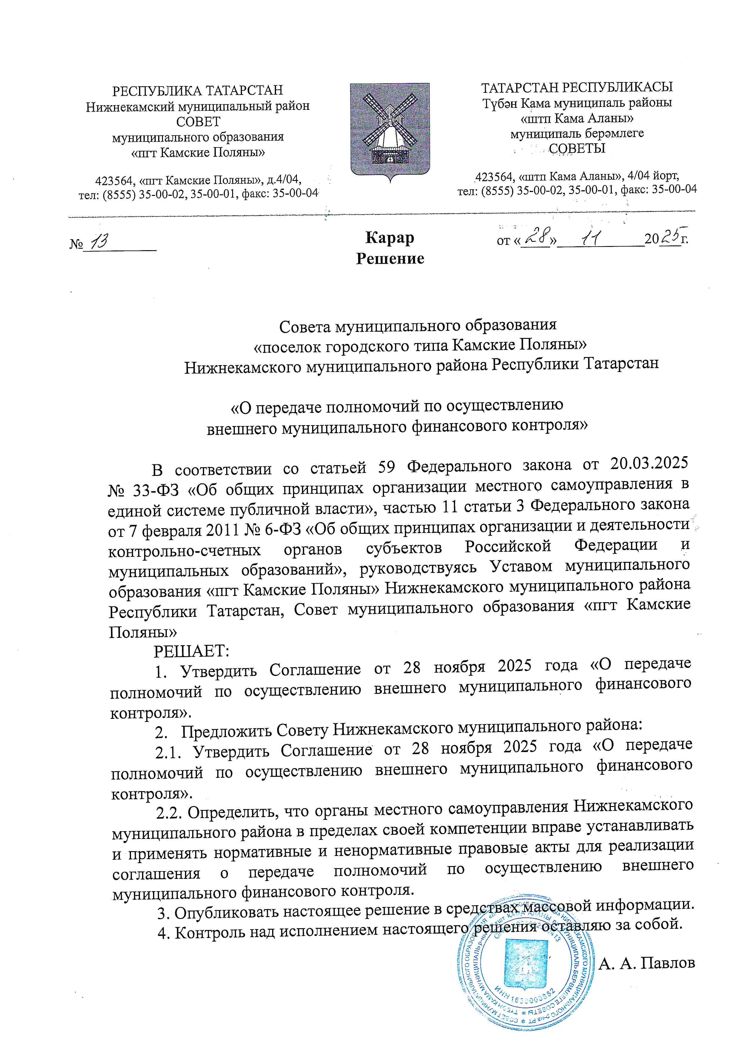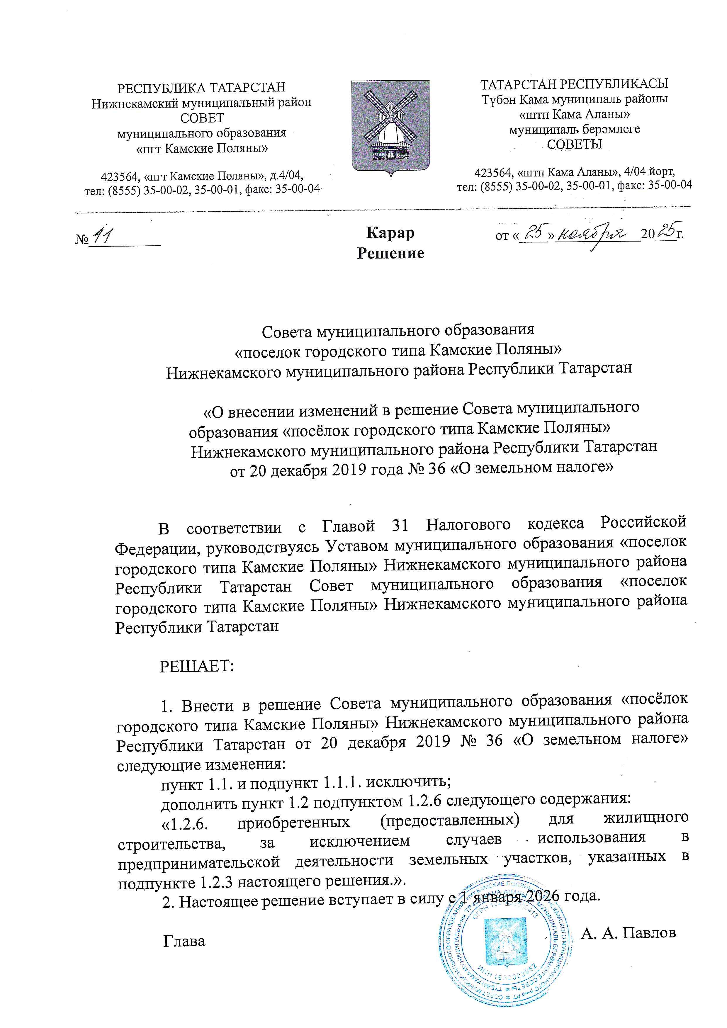 Решение от 29.12.2025 № 24 "О присвоении наименования топонимическому объекту городской среды в пгт Камские Поляны" PDF, 1,3 мб 29.12.2025 Решение от 29.12.2025 № 23 "О внесении изменений в решение Совета МО «пгт Камские Поляны» НМР РТ от 15.09.2021 № 23 «Об оплате труда работников МО «пгт Камские Поляны» НМР РТ" PDF, 1,5 мб 29.12.2025 Решение от 29.12.2025 № 22 "О внесении изменений в решение Совета МО «пгт Камские Поляны» НМР РТ от 15.09.2021 № 24 «Об оплате труда работников отд-х орг-й бюдж. сферы, МО, на кот. не распр. Единая тарифная сетка по оплате труда работников бюдж. сферы РТ" PDF, 1,8 мб 29.12.2025 Решение от 29.12.2025 № 21 " О внесении изменений в решение Совета МО «пгт Камские Поляны» НМР РТ от 25.04.2019 № 12 «Об орг. и усл. оплаты труда главных бухгалтеров и бухгалтеров Исполнительного комитета МО «пгт Камские Поляны» НМР РТ" PDF, 1,6 мб 29.12.2025 Решение от 29.12.2025 № 20 "Об утверждении прогнозного плана (программы) приватизации муниципальной собственности муниципального образования «поселок городского типа Камские Поляны» на 2026 год" PDF, 2,9 мб 29.12.2025 Решение от 15.12.2025 № 14 "О бюджете муниципального образования «поселок городского типа Камские Поляны» Нижнекамского муниципального района на 2026 год и плановый период 2027 и 2028 годов" PDF, 4,3 мб 15.12.2025 Решение от 28.11.2025 № 13 "О передаче полномочий по осуществлению внешнего муниципального финансового контроля" JPG, 924,9 кб 28.11.2025 Решение от 25.11.2025 № 12 "О присвоении звания "Почетный гражданин Камских Полян" в 2025 году" PDF, 1,1 мб 25.11.2025 Решение от 25.11.2025 № 11 "О несении изменений в решение Совета МО "пгт Камские Поляны" НМР РТ от 20.12.2019 № 36 "О земельном налоге" JPG, 825,7 кб 25.11.2025 Решение от 19.09.2025 № 5 "О проведении конкурса на замещение должности руководителя Исполнительного комитета муниципального образования «пгт Камские Поляны» НМР РТ" PDF, 3 мб 19.09.2025 Решение от 18.06.2025 № 18 "О назначении выборов депутатов Совета МО "пгт Камские Поляны" НМР РТ пятого созыва" PDF, 2,2 мб 18.06.2025 Решение от 29.05.2025 № 16 "О внес. изм-ий в перечень ветхих, нефункц. объектов муниц. собст-ти, подл-х обследованию, утвер. реш. Совета МО «пгт Камские Поляны» НМР РТ от 30.01.2023 № 3 PDF, 4,3 мб 29.05.2025 Решение от 29.05.2025 № 15 "О внесении изменений в решение Совета МО "пгт Камские Поляны" НМР РТ от 15.09.2021 № 24 "Об оплате труда раб-ов отд. орг-ций бюдж. сферы МО "пгт Камские Поляны", на которые не распр-ся ЕТС по оплате труда раб-ов бюдж. сферы РТ PDF, 4,7 мб 29.05.2025 Решение от 29.05.2025 № 14 "О внесении изменений в решение Совета МО "пгт Камские Поляны" НМР РТ от 25.04.2019 № 12 "Об организации и условиях оплаты труда главных бухгалтеров и бухгалтеров ИК МО "пгт Камские Поляны" НМР РТ" PDF, 4 мб 29.05.2025 Решение от 29.05.2025 № 13 "О внесении изменений в решение Совета МО "пгт Камские Поляны" НМР РТ от 15.09.2021 № 23 "Об оплате труда работников МО "пгт Камские Поляны" НМР РТ" PDF, 4,4 мб 29.05.2025 Решение от 18.04.2025 № 12 "Об утверждении Соглашения о внесении изменений в Соглашение от 27.04.2018 года о передаче Исполнительному комитету НМР РТ части полномочий Исполнительного комитета МО «пгт Камские Поляны" по решению вопросов местного значения" PDF, 1,3 мб 18.04.2025 Решение от 18.04.2025 № 11 "Об исполнении бюджета за 2024 год" PDF, 525,8 кб 18.04.2025 Решение от 18.04.2025 № 10 "О внесении изменения в решение Совета МО «пгт Камские Поляны» НМР РТ от 31 января 2025 № 1 «Об утверждении схемы одномандатных избирательных округов для проведения выборов депутатов Совета МО «пгт Камские Поляны» НМР РТ"" PDF, 680,7 кб 18.04.2025 Проект Решения Совета МО "пгт 
